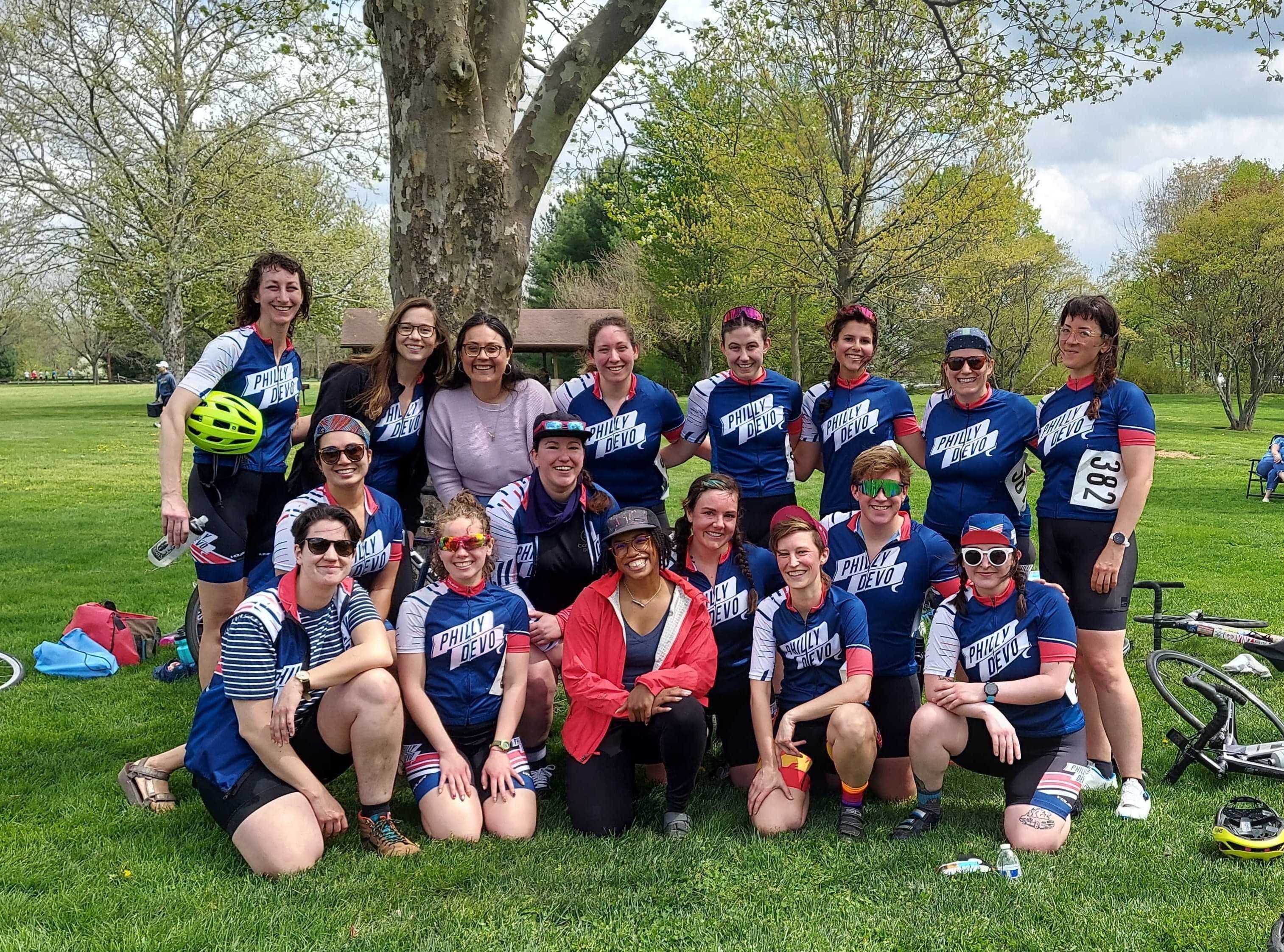 Philly Devo brings women, trans, and non-binary beginner riders together to grow skills and confidence in mountain biking and road riding and an introduction to competitive cycling with the road team. In addition to riding skills, the program emphasizes a train-the-trainer model for skill development, building and growing a community of confident mentors ready to teach new riders the basics.